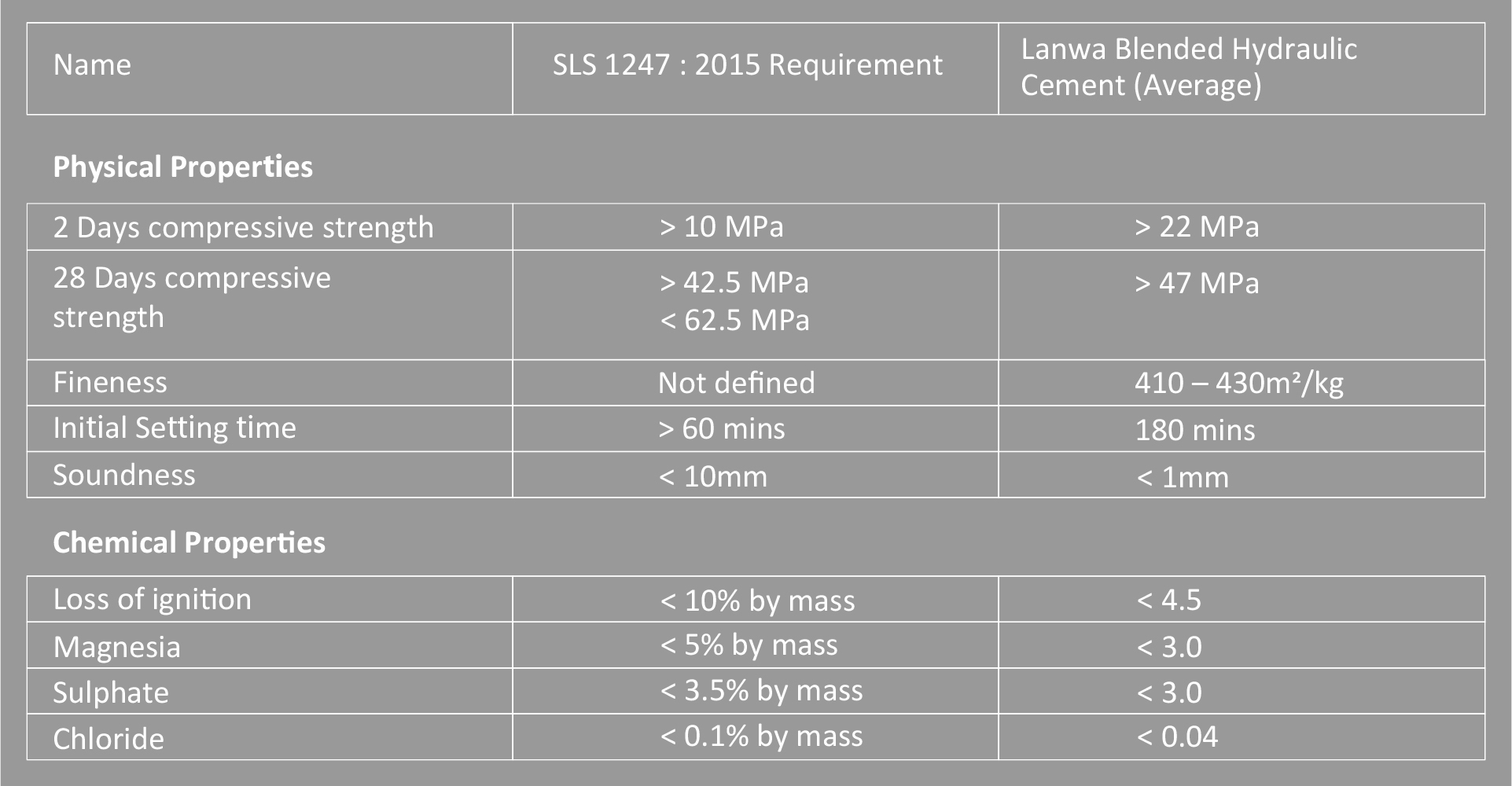LANWA Sanstha Portland Slag Cement is a quality-assured cement, manufactured in compliance with SLS 1247:2015 product specification, the national standard. The cement is produced using high-quality raw materials followed by strict quality control procedures focusing on the high consistency final product to exceed the customer’s satisfaction.